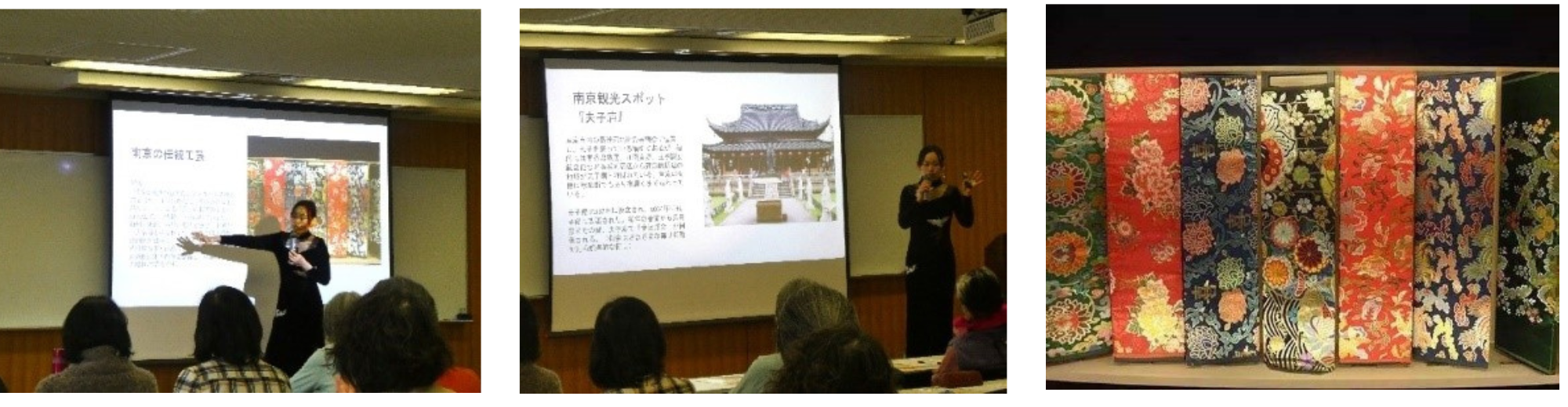 南京市の観光スポットや伝統工芸などを紹介してくれました。中でも、蘇州の宋錦・四川の蜀錦と並び、中国の三大名錦と称される南京の絹織物工芸品「雲錦」は、荘重な絵柄と鮮やかな色彩が特徴で、中国の絹織物技術の最高峰と言われているそうです。