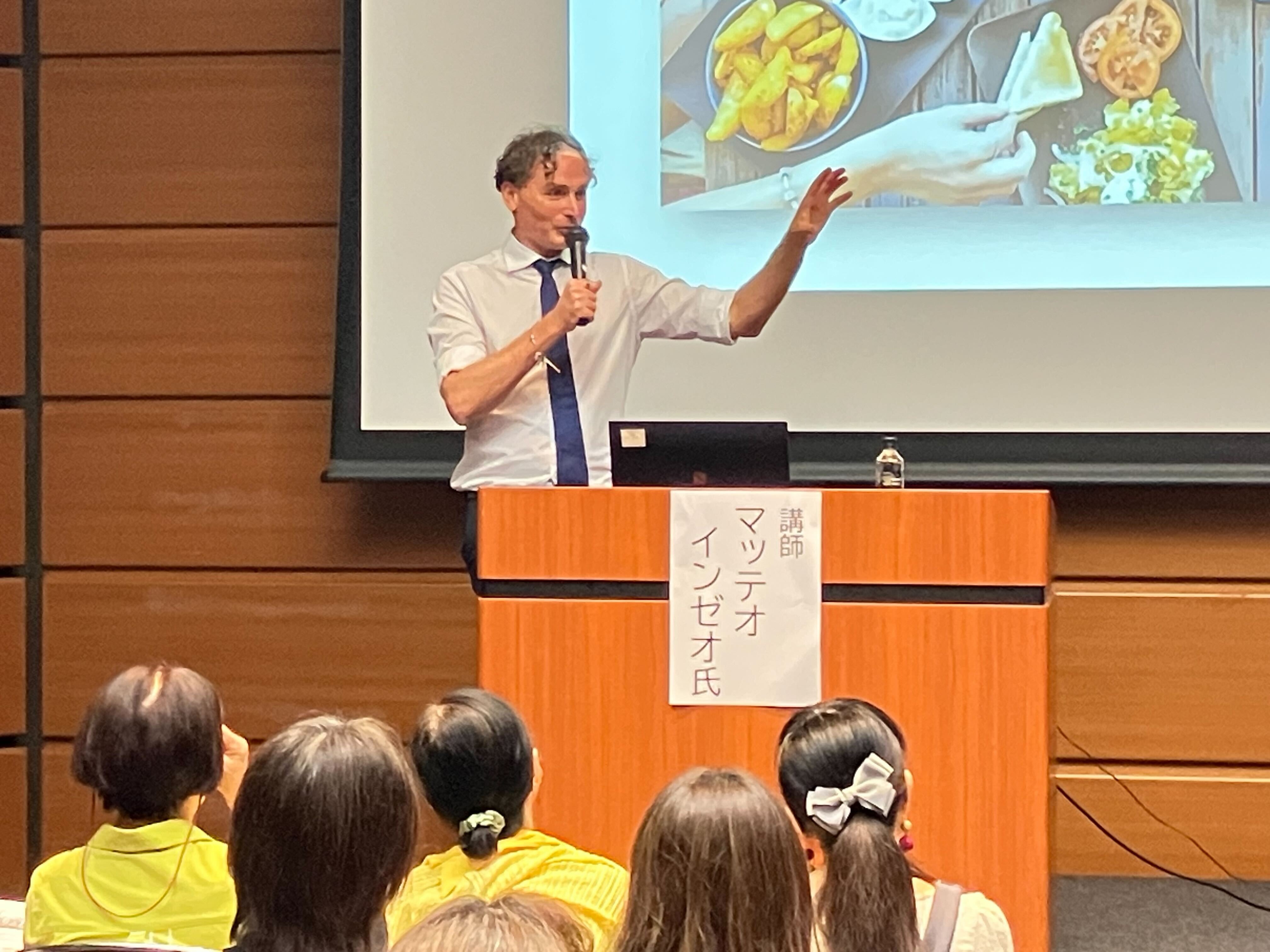 講演の後半では、イタリアと日本の文化における共通点や相違点についての話がありました。特に食文化においては、イタリアと日本は多くの共通点があります。様々な麺類があることや、魚介類をふんだんに使った料理が多くあること、食に対する深い敬意とこだわりがあることなどが挙げられました。