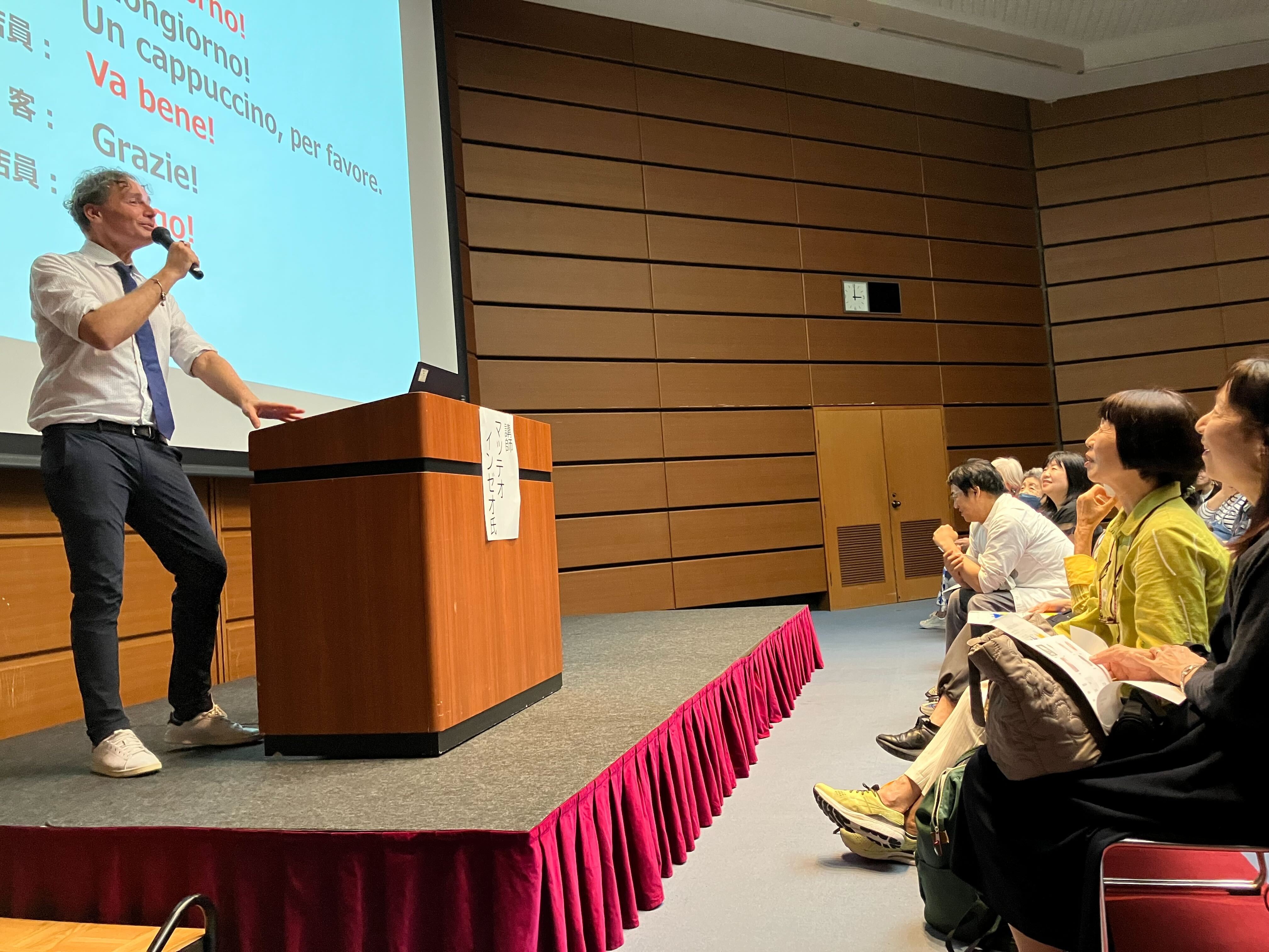 講演の最後には、マッテオさんによるイタリア語講座を行いました。挨拶や、Bar(バール...コーヒーなどの飲み物や軽食などを提供する飲食店)などでの注文の際に使える簡単なフレーズを教えてもらいました。マッテオさんに続いて発音をしたり、参加者同士で会話の練習をすると、会場は大いに盛り上がりました。