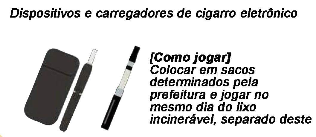 Os dispositivos eletrônicos para fumar, os cigarros eletrônicos, são produtos inflamávies e perigosos. O dispositivo e o carregador, devem ser acondicionados em sacos determinados pela prefeitura e colocados para coleta seletiva no mesmo dia do lixo incinerável, separado deste.