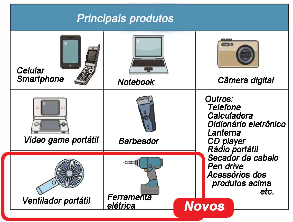 Principais produtos: telefone celular, smartphone, notebook, câmera digital, video game portátil, barbeador, calculadora, dicionário eletrônico, lanterna, CD player, etc.