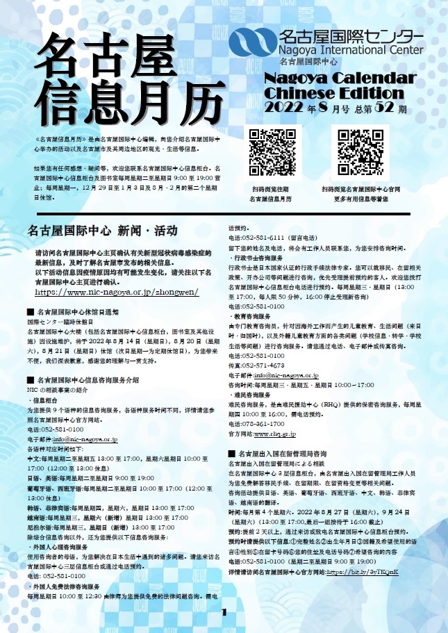 名古屋信息月历 2022年8月号-名古屋信息月历 第52期 下载(2022年8月号ナゴヤカレンダー中国語版Vol.52ダウンロード) 2022.08.31 下载 (PDF资料约 2.5 MB) 英语版/葡萄牙语版 请您关注NIC的twitter和Facebook!也期待您订阅邮件杂志,将会刊登每月的活动和新闻。 回到一览表