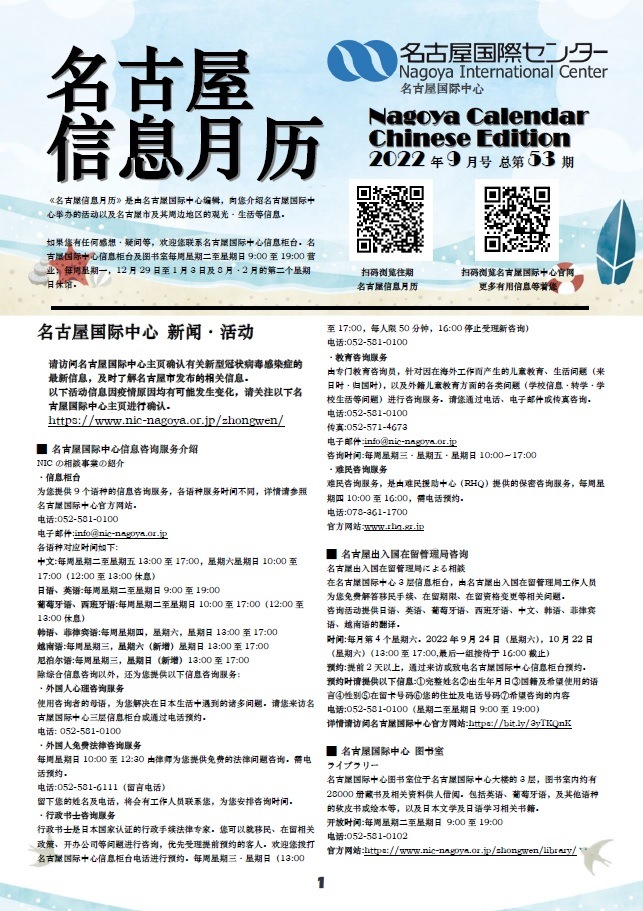 名古屋信息月历 2022年9月号-名古屋信息月历 第53期 下载(2022年9月号ナゴヤカレンダー中国語版Vol.53ダウンロード) 2022.09.30 下载 (PDF资料约 1.7 MB) 英语版/葡萄牙语版 请您关注NIC的twitter和Facebook!也期待您订阅邮件杂志,将会刊登每月的活动和新闻。 回到一览表